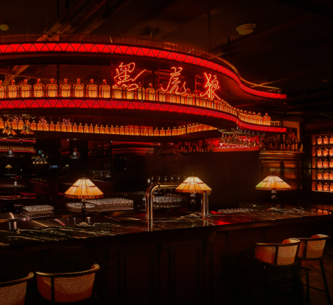 강렬한 레드 조명과 고급스러운 가죽 소파, 아시아 무드가 느껴지는 인테리어까지.