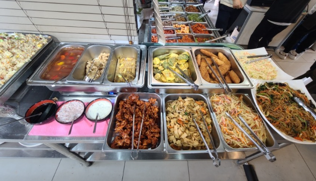 입장하면 먼저 계산을 한 뒤, 반찬 코너에서 식판에 원하는 반찬을 담는 방식으로 운영됩니다.