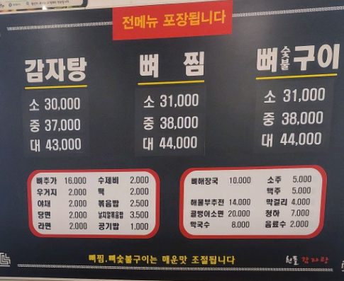뼈구이, 뼈찜 메뉴는 조리 시간이 20분 이상 소요되므로 사전 주문 또는 예약 권장 맵기 조절 가능: 순한맛은 아이도 먹을 수 있을 정도이며, 매운맛은 불닭볶음면보다 약간 순한 정도 방송 이후 혼잡할 수 있으니 전화 확인 후 방문 추천